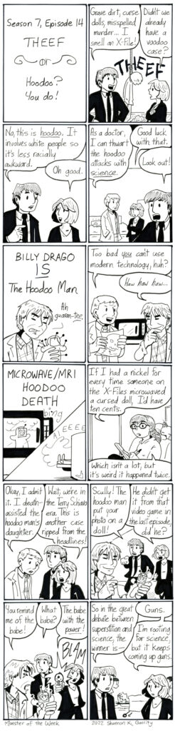 I respect the X-Files for almost never having big guest stars. It’s mostly future celebrities and absolute top-drawer character actors. Billy Drago has the perfect face for an X-File. I could go for more witchcraft-centric episodes. Witches are great.